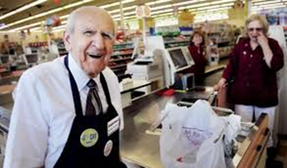 When there is a lull in customer traffic, he is out sweeping the sidewalk in front of the store entrance.