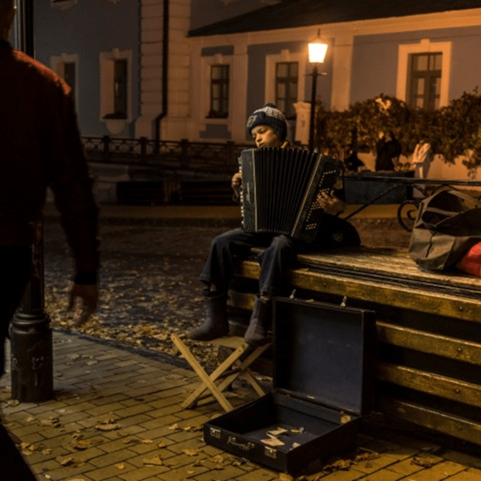 The photo is of a young boy playing his accordion in Kyiv, Ukraine.
