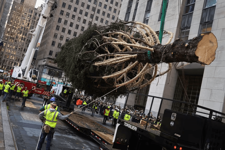 The Rockefeller Center Christmas tree was hoisted aloft at its new home in Manhattan on Saturday, marking the start of New York City’s holiday season.